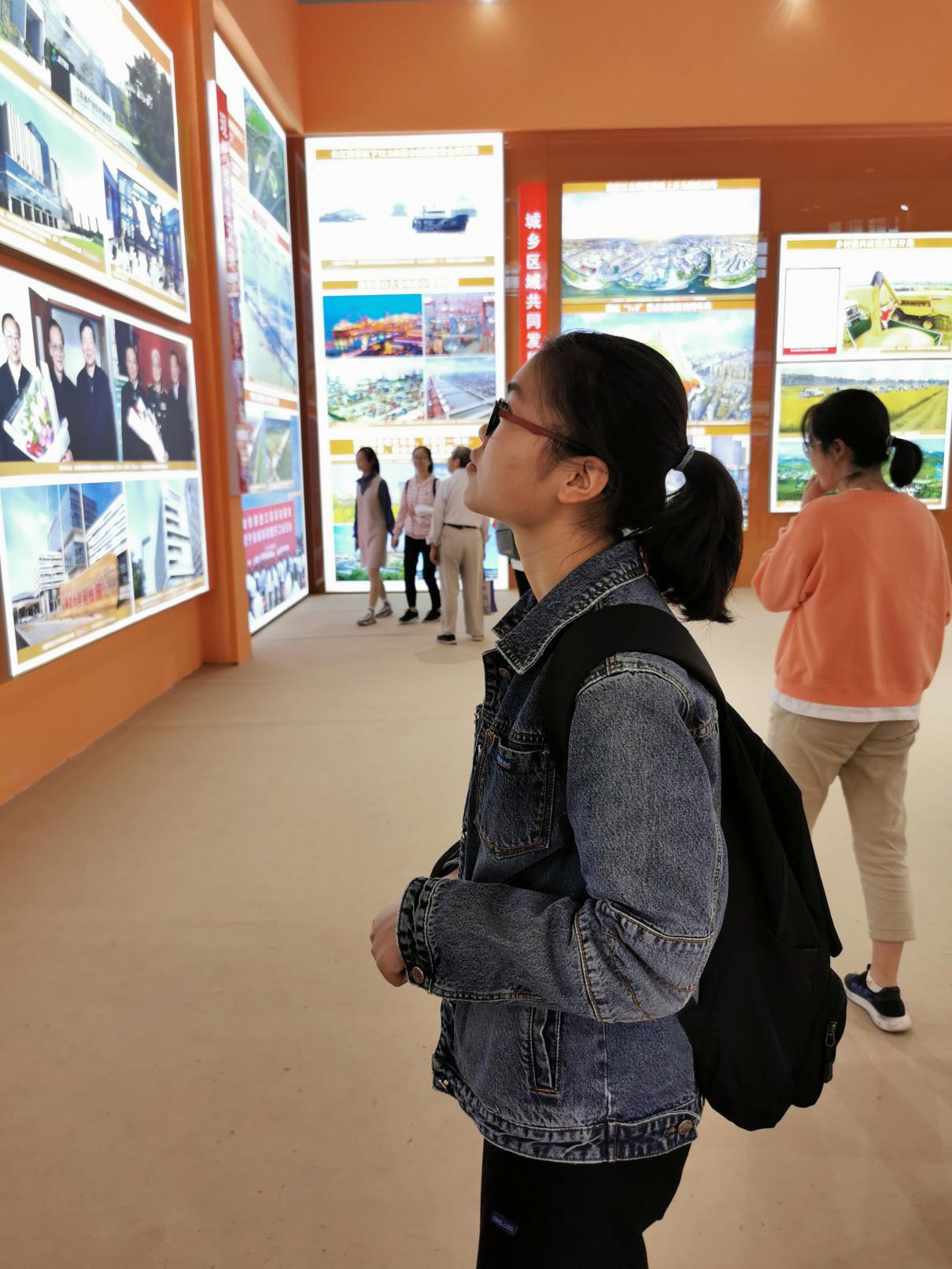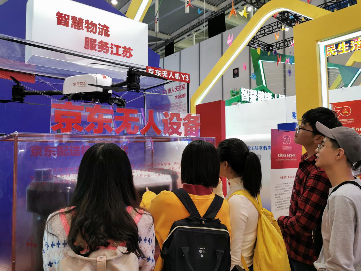 本次主题成就展通过典型图片、实物模型、场景还原、动态演示、互动体验等多种方式,生动展示了在党中央的正确领导下,新中国成立70年来江苏建设、改革、发展的伟大历程。参观展览的同学们被江苏在科技、教育、工业、农业、医疗、城市建设等各方面获得的巨大成就所震憾。做为邮政、物流业的储备军,大家在看到观展室内陈列的苏宁5G“卧龙”无人车和京东配送机器人3代十分欣喜,大家感受到智慧物流的迅猛发展,也切实体会到计算机、人工智能的研究为如今人民生活提供的诸多便利。
