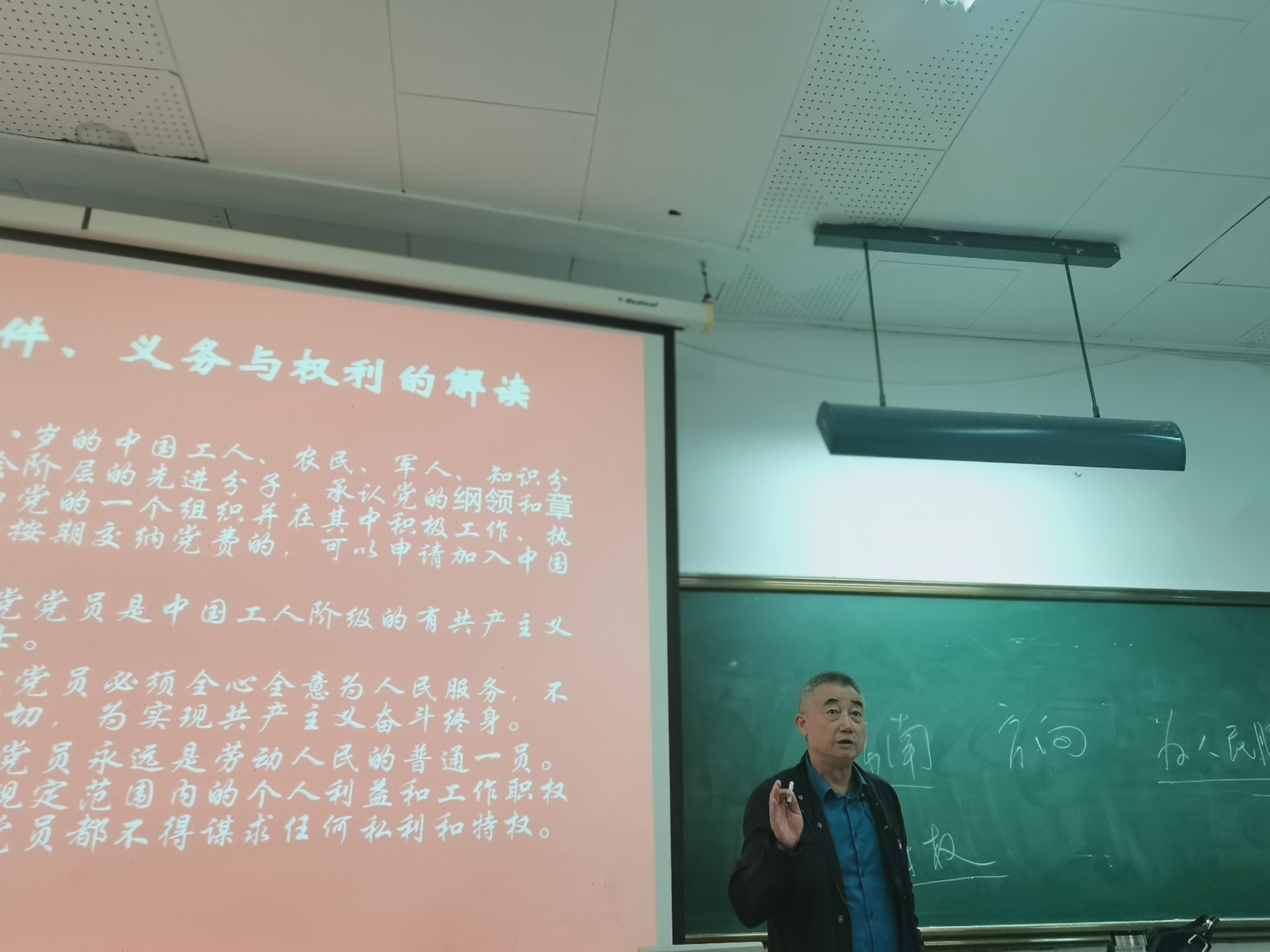 接着,储教授分别围绕“条件、义务与权利的解读”、“义务权利之间的关系”、“老员工如何做先锋模范”三方面内容进行详尽阐释。他指出,党员在履行义务和行使权利时都具有鲜明党性,“没有无义务的权利,也没有无权利的义务”。党员的义务和权利之间是相辅相成的关系,互为条件。他强调,入党积极分子要在员工中发挥先锋模范作用,树立远大的共产主义理想,努力提高自身的品行修养与理论水平,完成好自己的学习任务,并且要融入同学中去,互帮互学、共同进步。他勉励各位同学“学到老、活到老、改造到老”,不断提高理论修养和专业水平,提高热爱集体、乐于奉献的自觉性,为国家发展建设贡献个人力量。