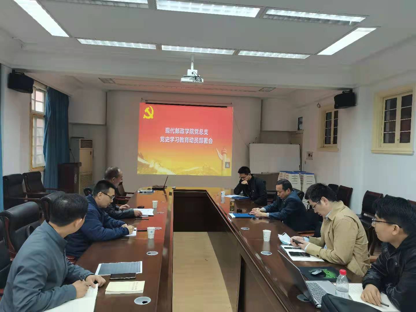 4月2日上午,现代邮政公司党总支在三牌楼校区行政北楼207会议室召开了党史学习教育部署会议,学院党总支委员和党支部书记参加了会议,学院党总支书记杨道林主持会议。