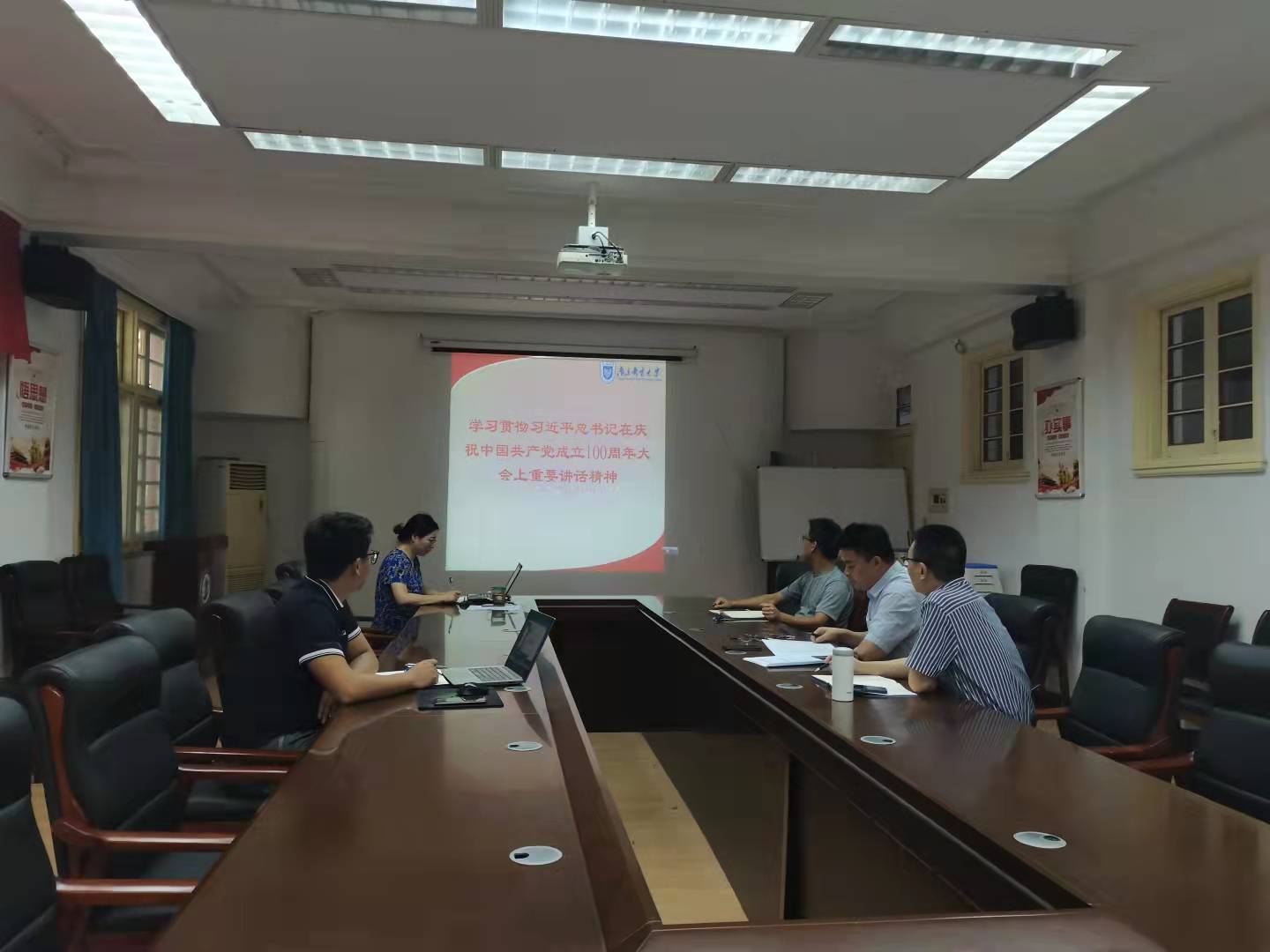 9月10日,现代邮政公司党总支理论学习中心组在三牌楼校区行政北楼207会议室专题学习习近平总书记在庆祝中国共产党成立100周年大会上重要讲话精神。学院党总支理论学习中心组组长、党总支书记薛晓华主持学习会。
