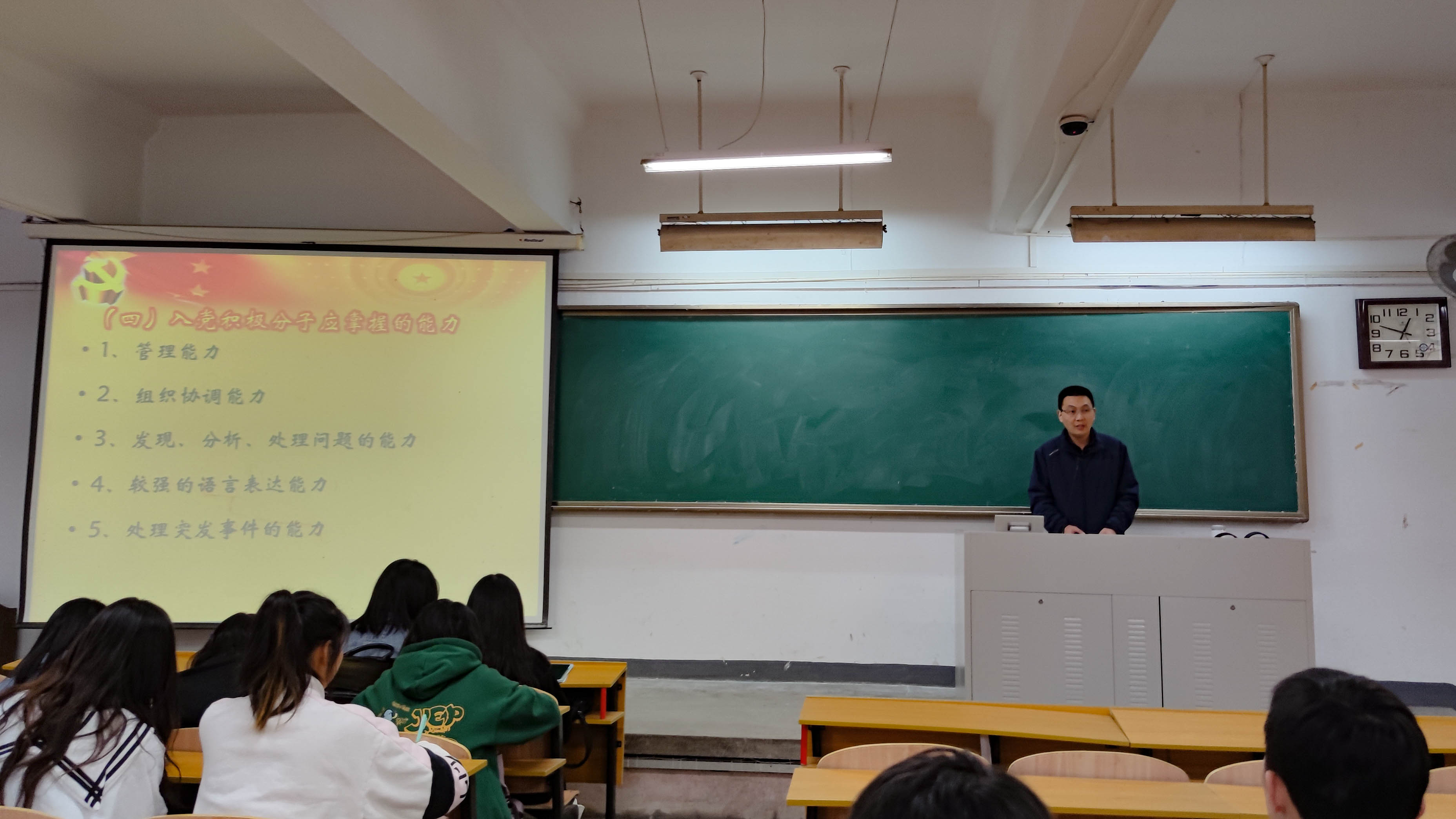 刘书记围绕“入党积极分子如何充分发挥先锋模范作用”展开授课。首先,他立足于当代老员工的实际情况,引导入党积极分子端正入党动机,在行动上向党组织靠拢的同时充分利用学校提供的平台丰富自己的理论知识,在思想上深入地了解党、相信党,杜绝不良入党动机。随后,刘书记从习近平总书记对新的历史条件下共产党员先锋模范作用的四点要求谈起,鼓励入党积极分子坚定理想信念、牢记党的根本宗旨、创造一流业绩、实践社会主义核心价值体系。他强调,老员工应当有意识地在品质、能力、行为上约束、提升自我。最后,刘书记谈到了入党积极分子发挥先锋模范作用存在的问题及原因,要求大家能坚定理想信念、以共产党员的身份严格要求自己、努力向党组织靠拢,形成合力。