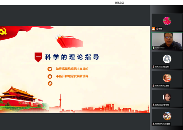 薛书记以中国共产党百年发展历程为主线,讲述中国共产党如何从一叶扁舟发展成今日巍巍巨轮的过程。他强调:“中国共产党之所以能够完成近代以来各种政治力量不可能完成的艰巨任务,就在与我们党选择了并始终把马克思主义这一科学理论作为自己的行动指南,坚持在实践中不断丰富和发展马克思主义。”从毛泽东思想、邓小平理论、“三个代表”重要思想、科学发展观,到习近平新时代中国特色社会主义思想,中国共产党人在理论发展的道路上,紧跟时代,贴切国情,在时代的风口浪尖交出了成绩斐然的答卷。他希望学员们了解党的光辉奋斗史,珍惜现在来之不易生活,不忘初心,砥砺奋进。
