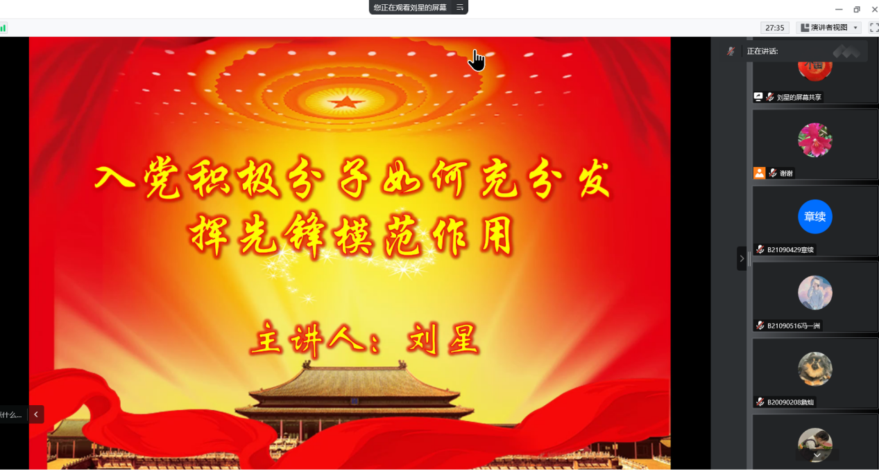 刘星副书记以《员工党员先锋模范作用的发挥》为题,与同学们一起探讨了作为一名入党积极分子,如何才能在日常学习生活中发挥模范作用?他强调,同学们作为入党积极分子不仅需要学习成绩优异、群众基础良好,还必须要有正确的价值观,认真学习贯彻党的基本理论方针,在日常生活中培养团队协作精神与奉献精神,严于律己,这样才能做好表率与榜样作用。他勉励大家,在今后的学习生活中,一定要坚定自己的信仰,努力实现自己的人生价值,以服务祖国、服务社会、服务人民为目标,成为堪当民族复兴重任的时代新人。