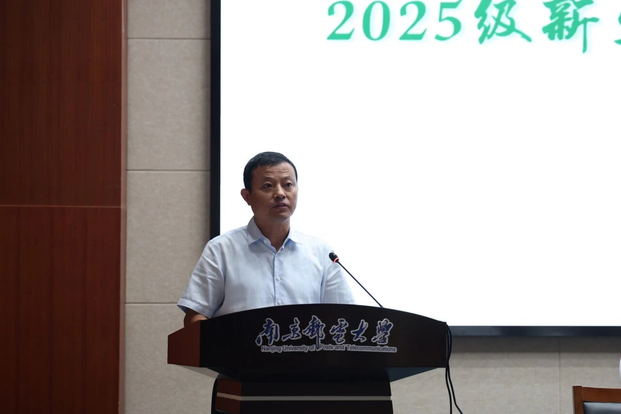 2025级新生家长代表胡尧发言。他表达了对学院的信任与感谢,希望孩子们在南邮的培养下,能学会独立、勇于探索,在现代邮政与智慧交通领域找准定位,成长为有责任、有担当的新时代青年,同时也表示家长们会全力支持孩子的大学学习与生活。